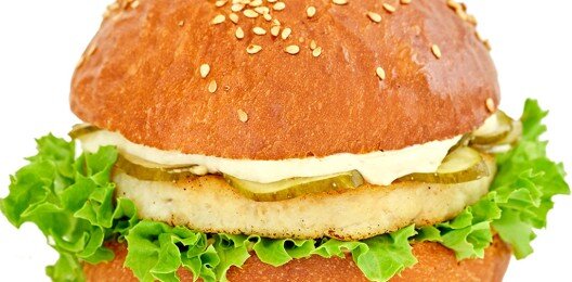 Картофельная булочка, котлета из курицы, бекон, маринованный огурец, лист салата, жареный лук, чесночный соус, барбекю соус