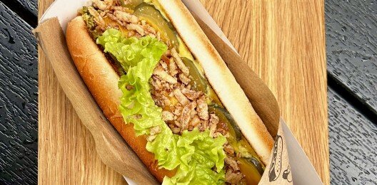 Булочка, колбаска говяжья, сыр "Чеддер", листья салата, лук жаренный, консервированная кукуруза, халапеньо, соус горчичный, фирменный барбекю соус